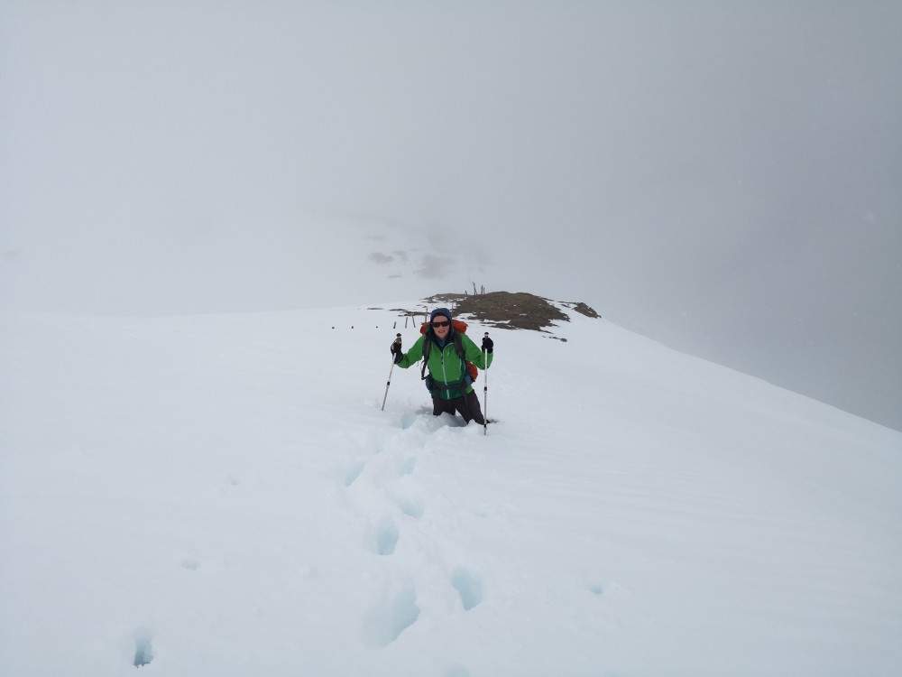 Kurz vor dem Gipfel wühlen wir uns dann durch hüfttiefen Schnee nach oben. Außerdem macht auch das Wetter nicht mehr