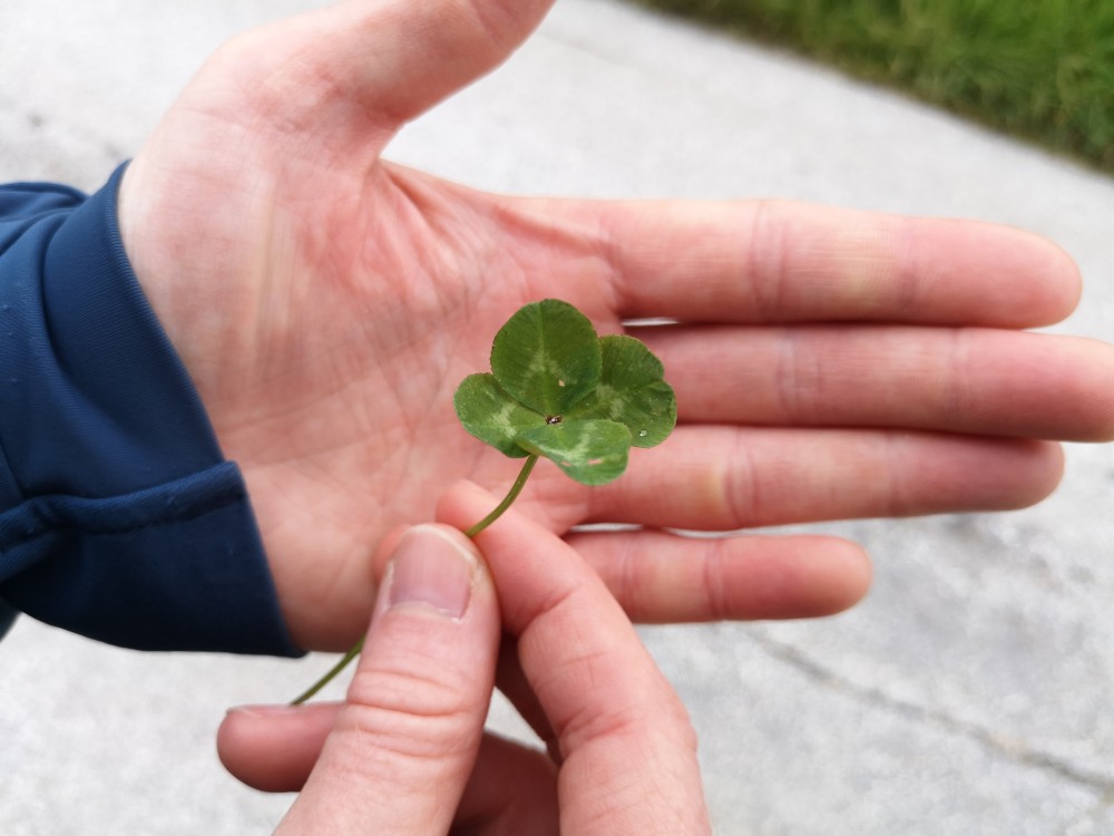 Kurz vor dem Parkplatz entdeckt meine Frau mit ihren Adleraugen unter Millionen von dreiblättrigen Kleeblättern tatsächlich
