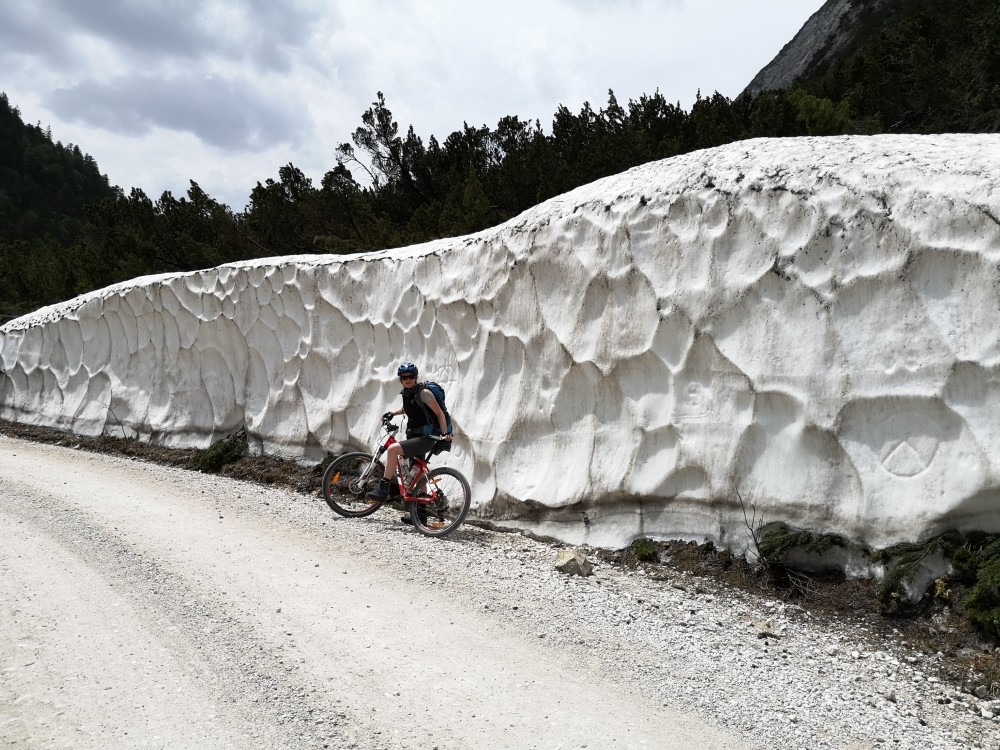 weit die Räder über sulzigen Schnee tragen und sind uns sicher, in diesem Jahr die ersten Radfahrer dieser Strecke