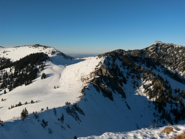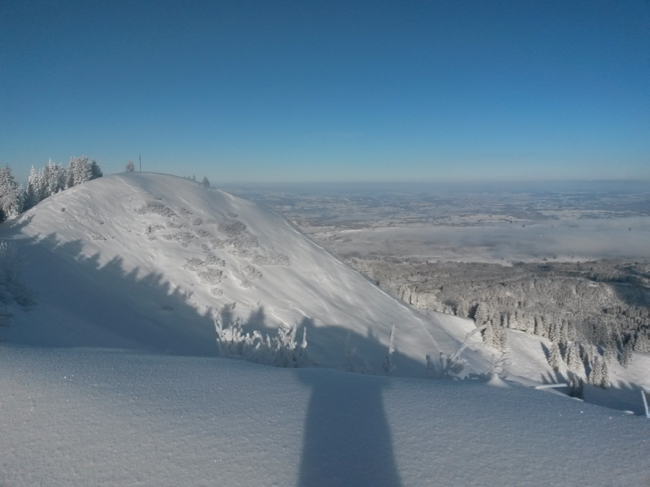 Der Blick vom Gipfel über das kalte Unterland. Wer genau hinsieht, kann ein paar Heissluftballone erkennen,