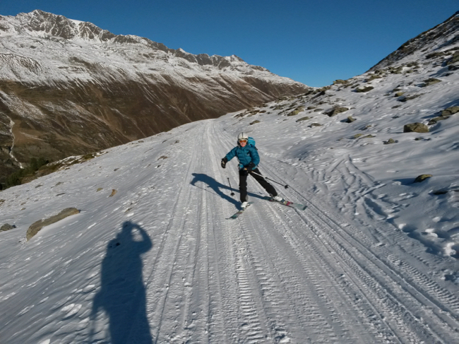 dünne Schneeschicht zu finden. Daher starten wir notgedrungen mit einer Pistenskitour von