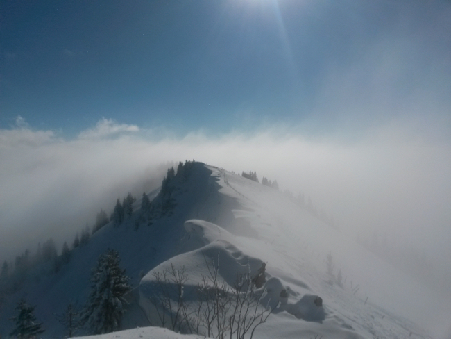 des Gipfelgrates schon wieder im Blindflugmodus Richtung Firstalm im Skigebiet