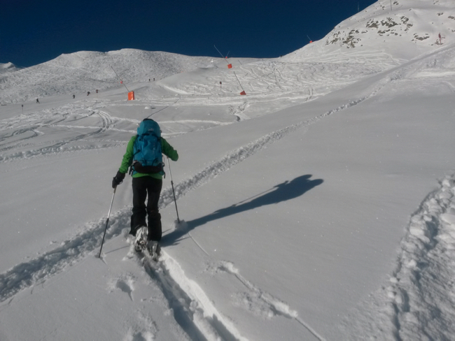 Einstieg in den Tourenwinter. Auch die Abfahrt über das Skigebiet ist nicht zu