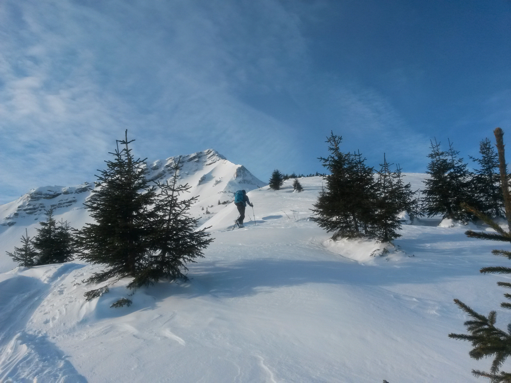 Über dem Waldstück laufen wir gemütlich den schönen Hang bis zum Skidepot nach oben.