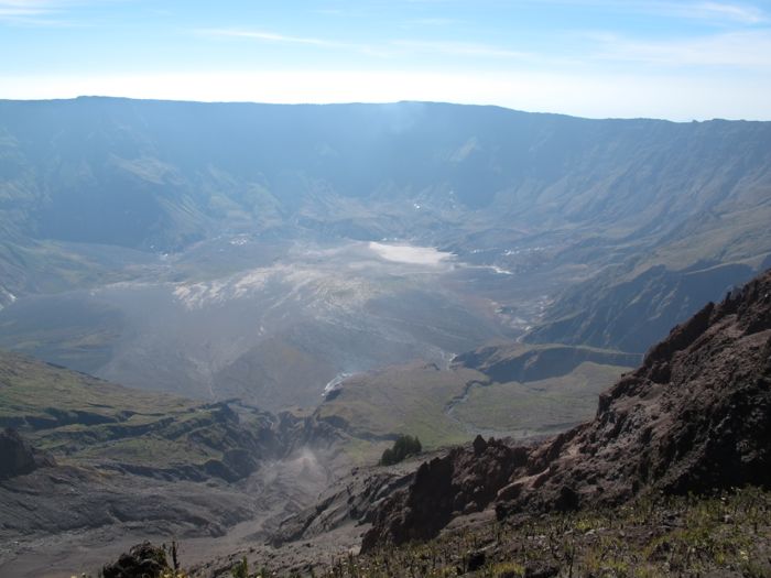 Der Blick in den gewaltigen Krater das Tambora - etwa 7 km im Durchmesser bei einer Tiefe von 800 Metern. Vor seinem Ausbruch im Jahre 1815 war der Berg etwa 4500 m hoch, danach nur noch ca. 2800 m.