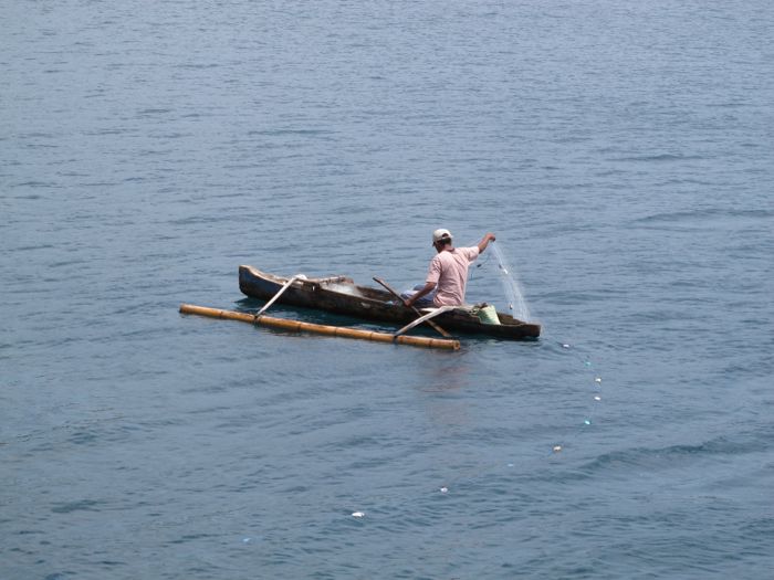 Immer wieder sehen wir auf unserer Seefahrt die typischen Auslegerboote. Hier wirft ein Fischer sein Netz kreisförmig aus.