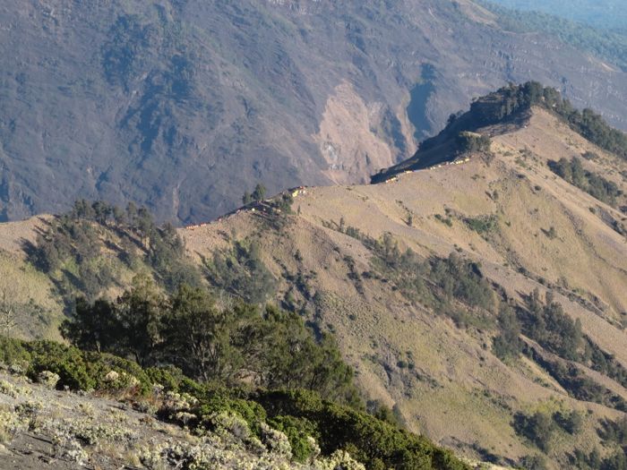 Bald sind wir wieder am zweiten Lager Pelawangan II angekommen. Die Zelte sind am Grat wie auf einer Perlenschnur aufgereiht.