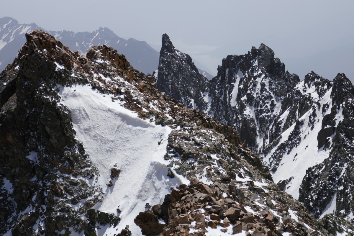 und schauen hinüber zum nächsten Ziel, dem Alam Kuh. Der höchste Gipfel des gleichnamigen Massivs baut sich vor den grauen Wolken auf, die im Laufe der letzten
