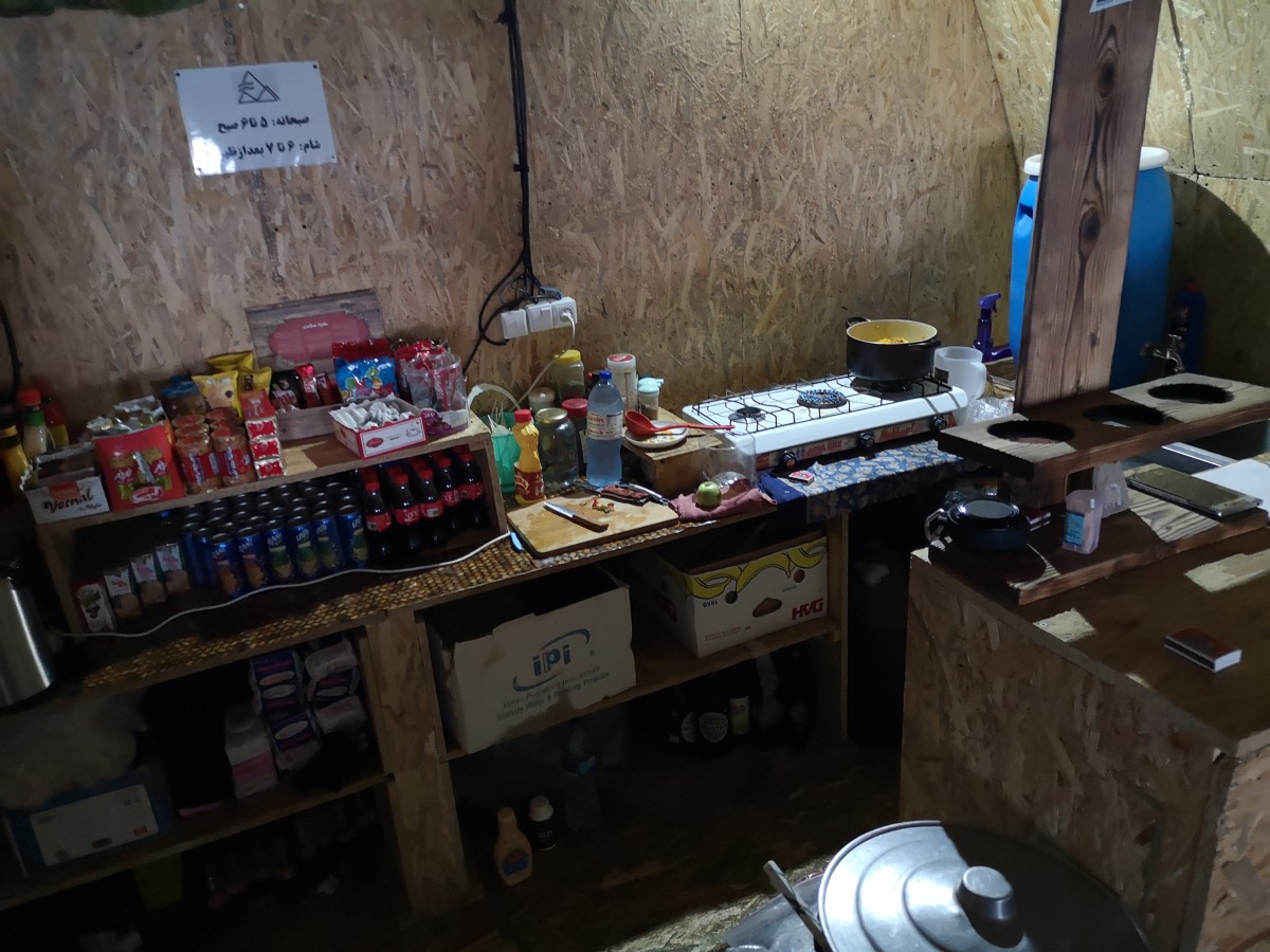 Unser Abendessen nehmen wir daher in Mehdis Zelt zu uns. Wie auf Expedition bekocht er uns mittels eines Kochers in einer Apsis des Zeltes, und wir üben uns im