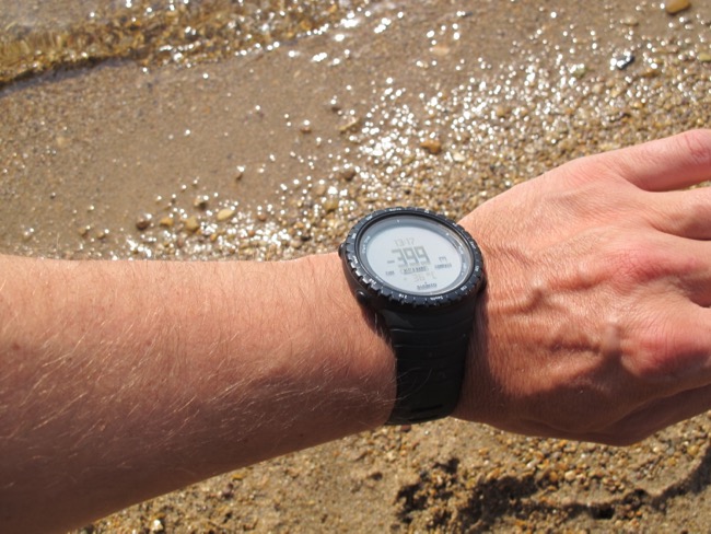 Der Höhenmesser direkt am Ufer des Toten Meeres zeigt minus 399 Meter an.