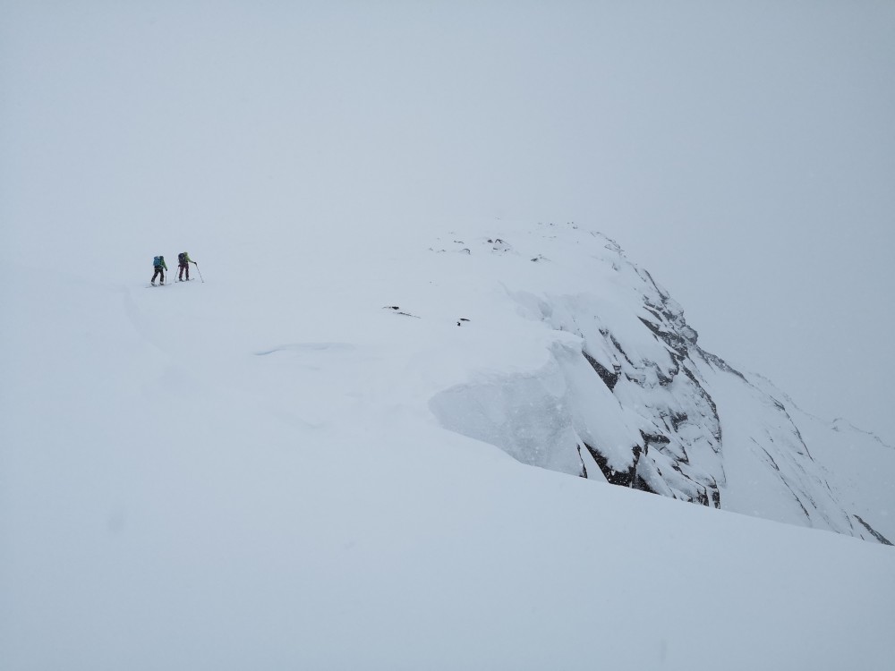 Am Gipfel erwarten uns durchwachsene Bedingungen; daher fellen wir zügig ab und absolvieren