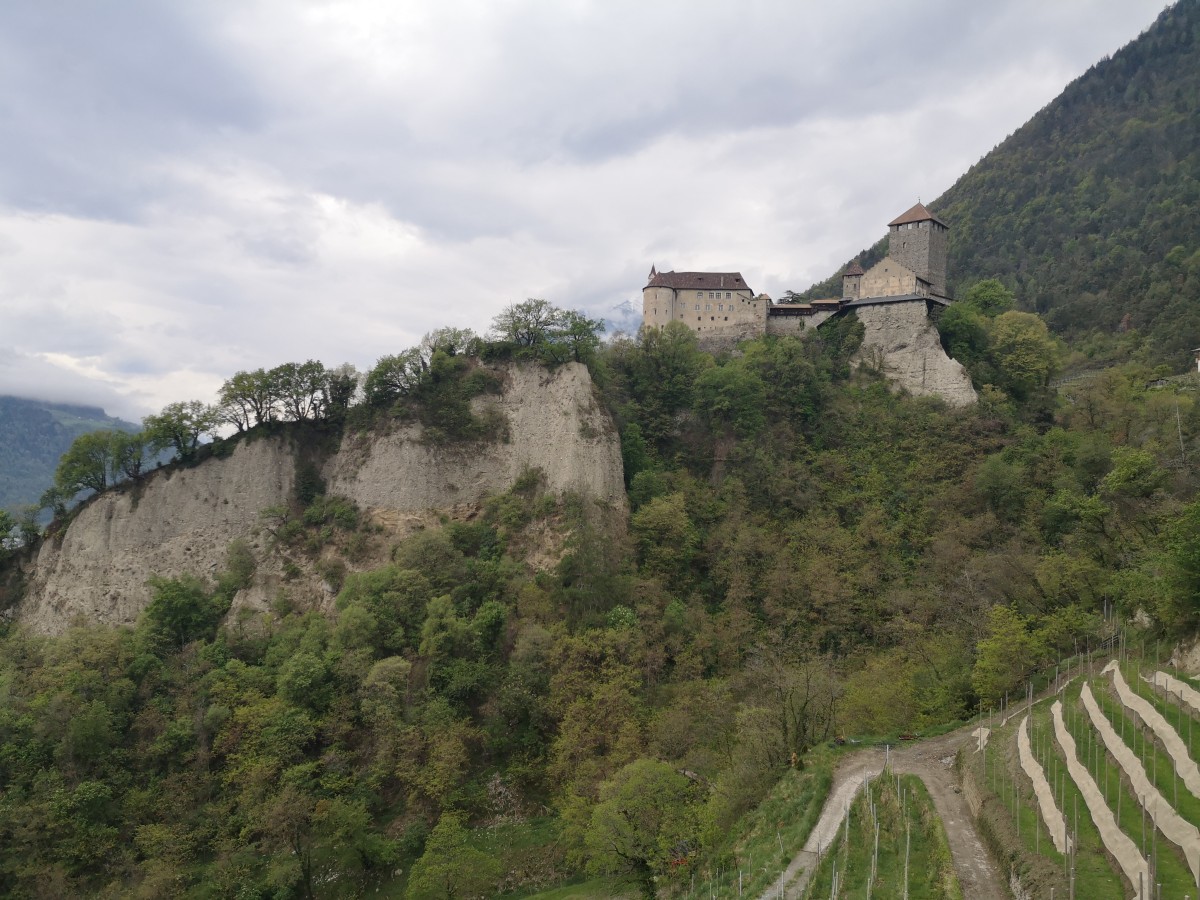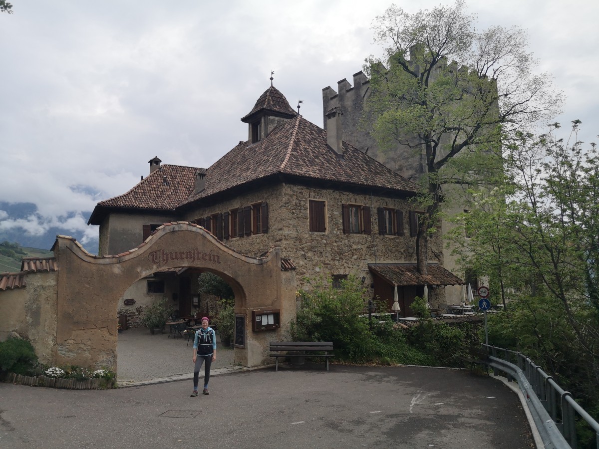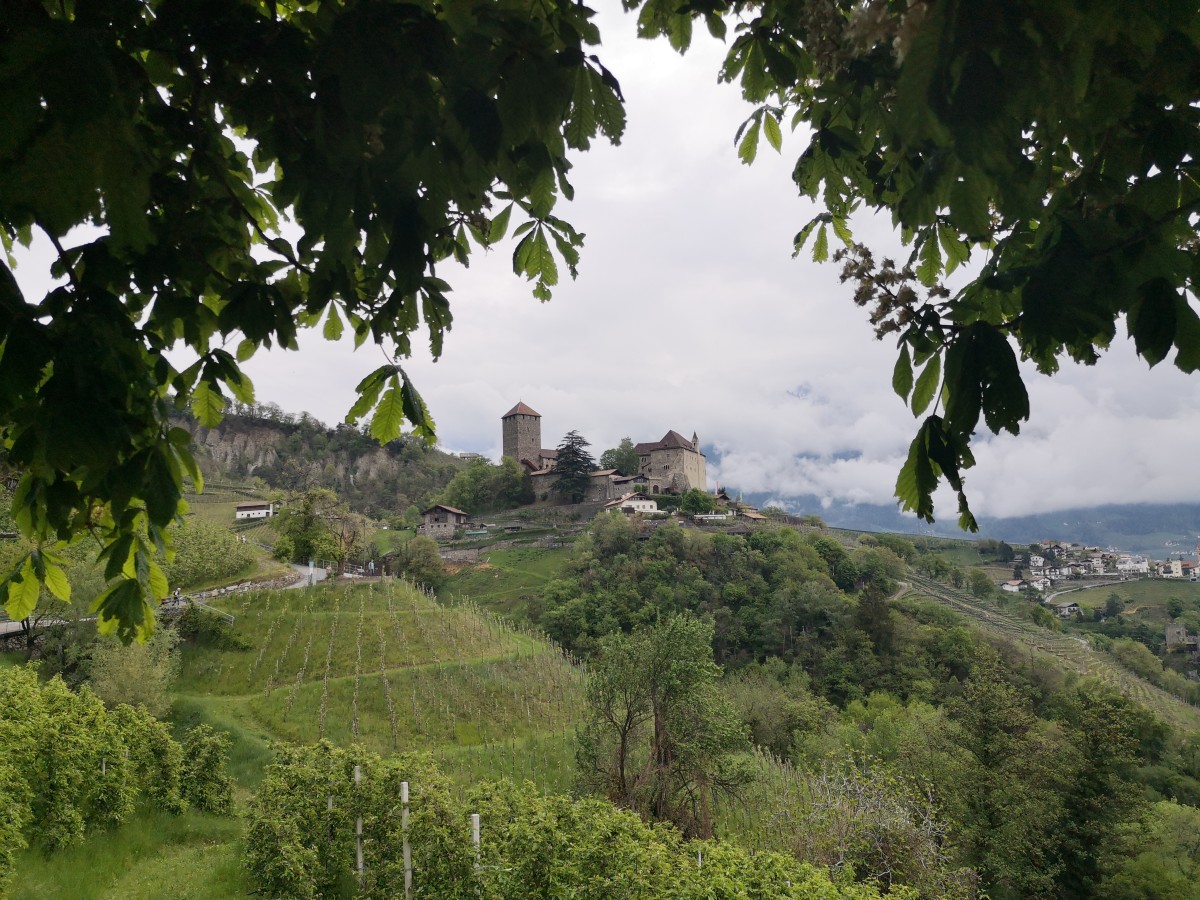 Am Schloß Tirol gönnen wir uns eine Pause mit Getränk, ehe es durch den Knappentunnel Richtung Dorf Tirol weitergeht. Im Rückblick mache ich eine weitere