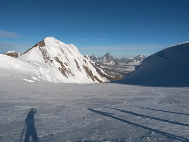 Auf dem Weiterweg kommt hinter dem menschenfressenden Liskamm das Matterhorn in Sicht.