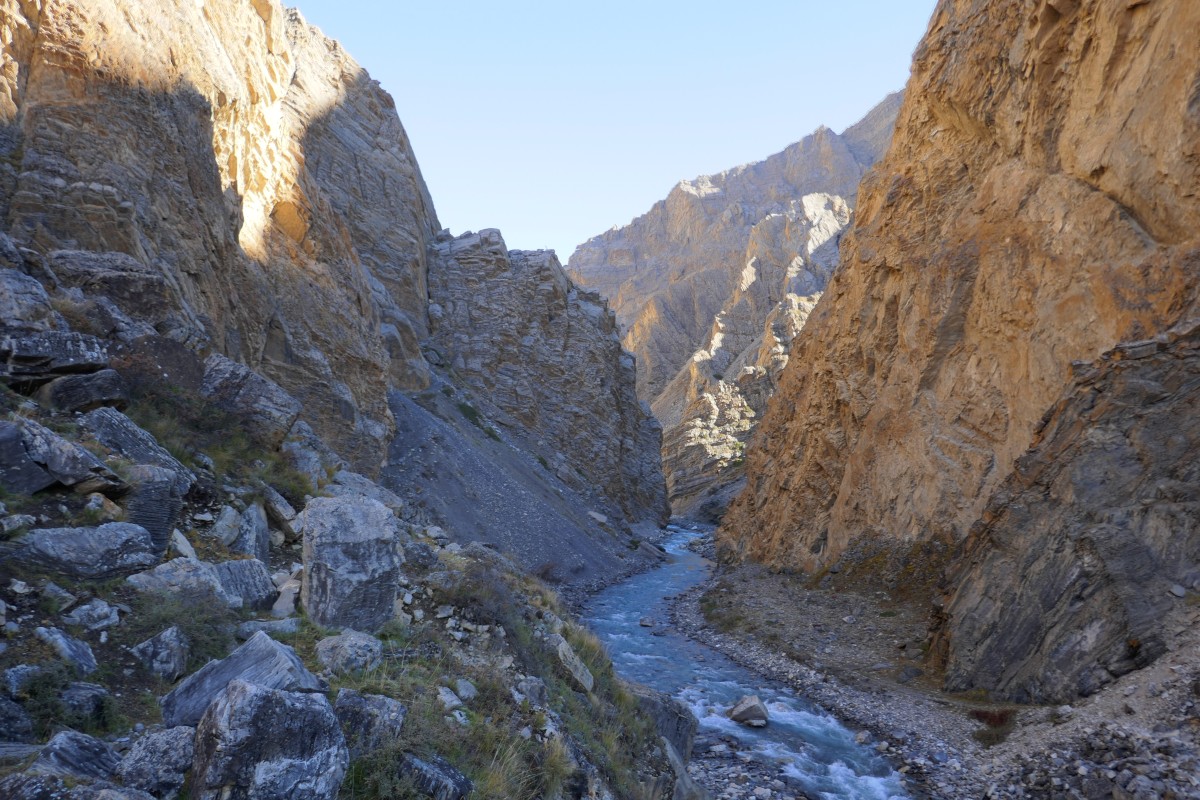 Hinter dem Lager ist bereits der Weiterweg des nächsten Tages auszumachen. Es wird spannend werden; die Schlucht des Chharka Tulsi verengt sich von beiden Seiten