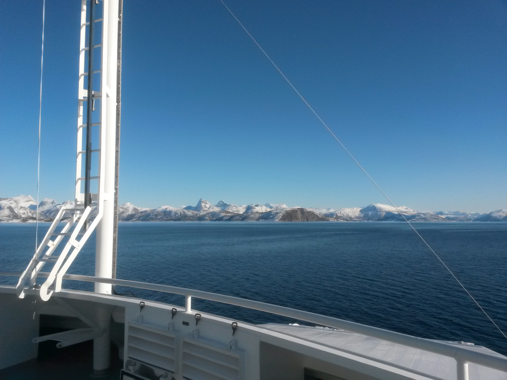 Das Fährschiff setzt uns zunächst nach Bognes über. Auf der Überfahrt werfen wir die ersten Blicke auf die