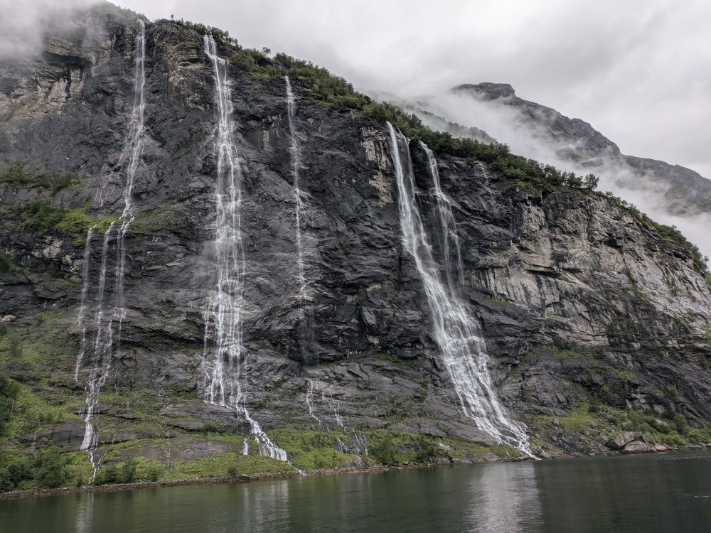 Die sieben Schwestern stürzen von Norden her in den Fjord.