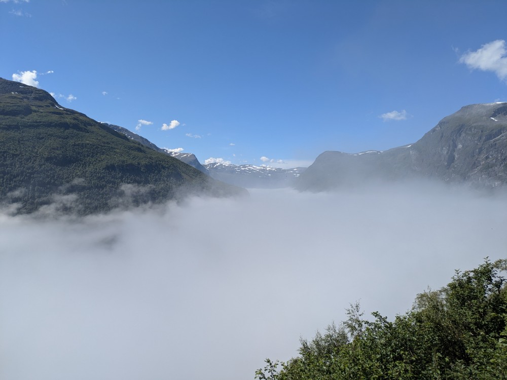Der Blick hinunter ins Geirangerfjord ist nicht minder spektakulär. Tief unter uns hält sich ein Wolkenmeer genau über dem Fjord.