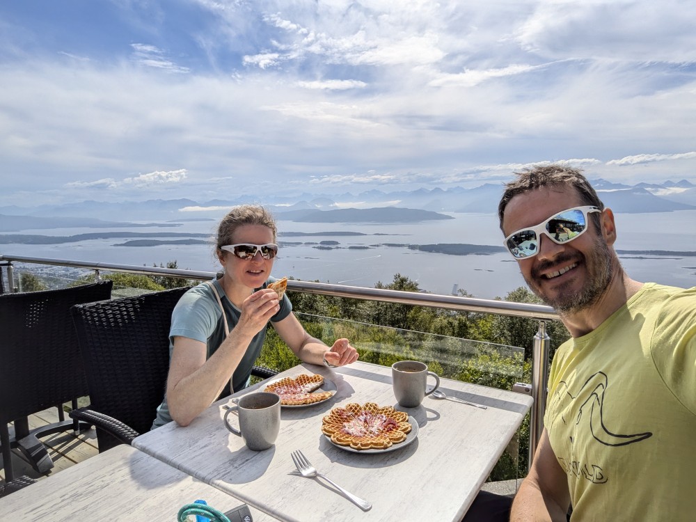 Wir sehen vom Varden aus den Fährbooten zu, mit denen auch wir nach Molde gekommen sind, und genießen den wunderbaren Abend hier heroben. An den