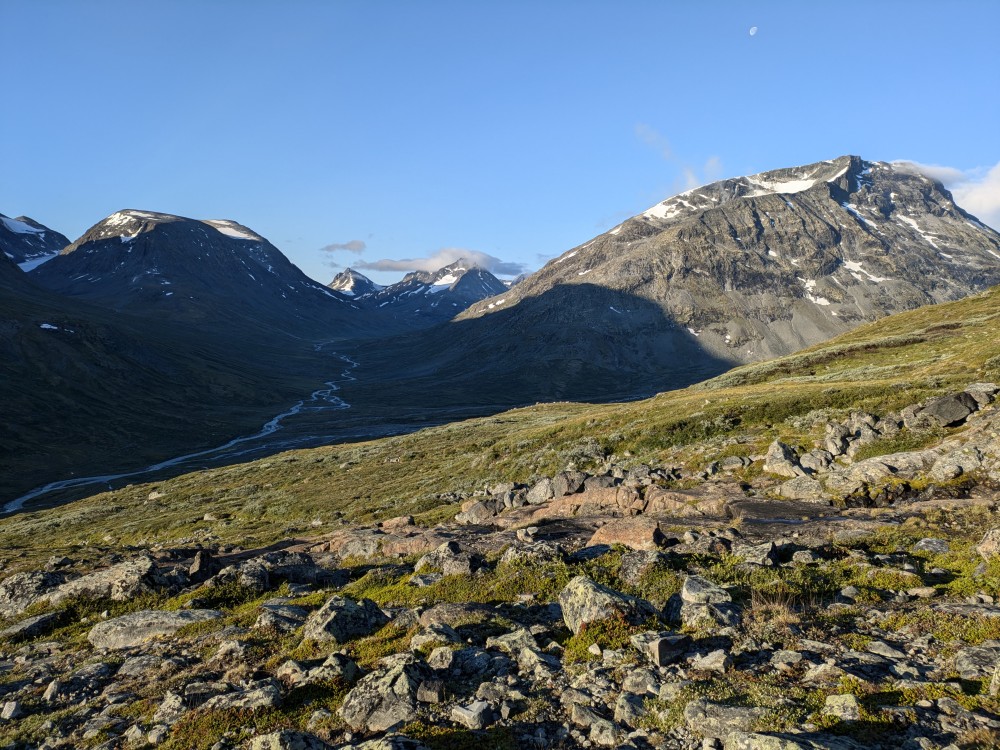 sechs in der Früh starten wir den langen Anstieg. Die Styggehøe im Süden leuchtet über den schattigen Tälern in der Morgensonne.