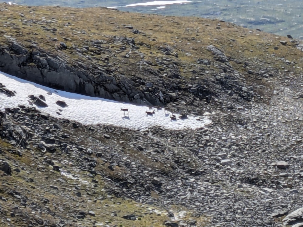 Im ersten Augenblick in alpiner Gewohnheit fälschlicherweise als Gämsen verbucht erkennen wir auf einem Schneefeld - Rentiere!
