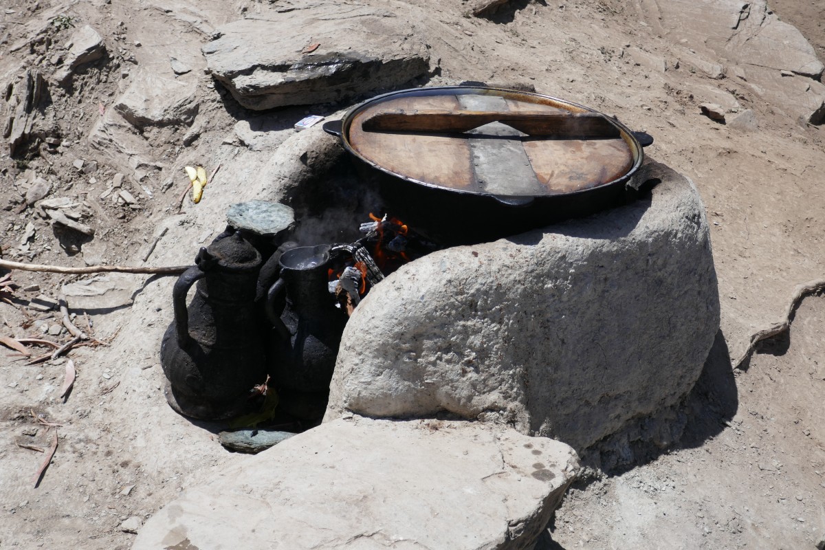 Hirten waschen Wäsche. Heißwasser wird in der großen Blechschale über einem Feuer bereitet, nebenan wird fleißig geschrubbt.