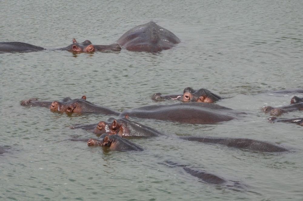 Immer wieder Herden von Nilpferden, von denen meist nur Nase, Augen und Ohren über der Wasseroberfläche sind
