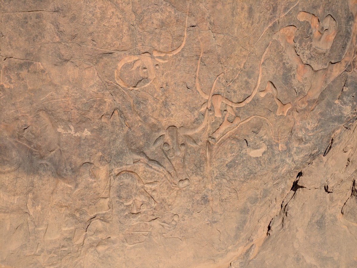 Weltkulturerbe ein: Die Felsgravur der weinenden Kuh. An einer von zwei benachbarten schroff aus der Ebene aufragenden