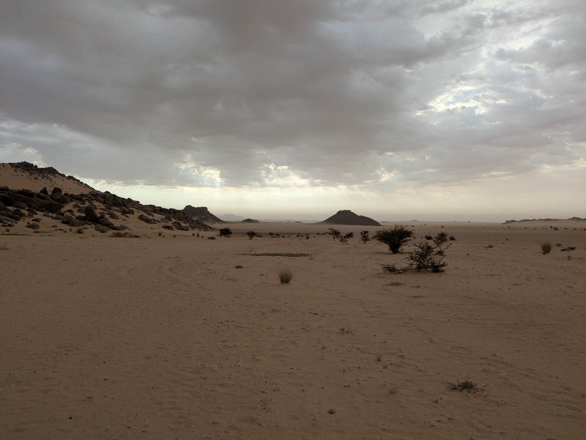 Schließlich erreichen wir die offene Fläche. Dahinter Zeichnen sich die Dünen des Erg Admer ab, in denen wir das ersten