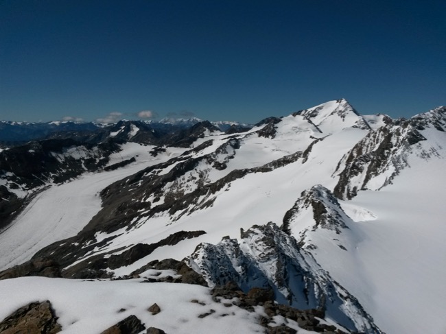 Vom Gipfel geht der Blick vorbei an der Weißkugel Richtung Ortler und Königsspitze.