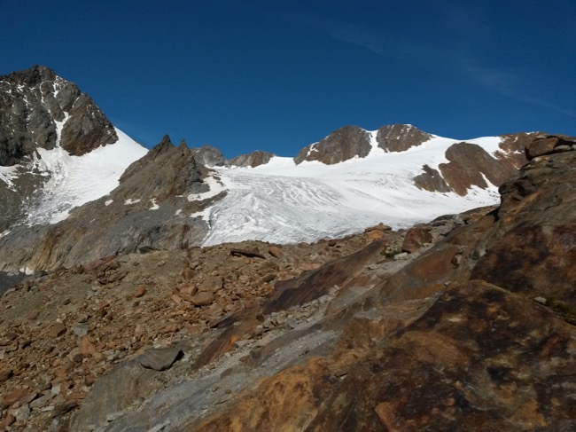 Gipfel ab zum Gletscher. Ein paar Meter weiter kommen große Felsen in den Blick, die schön