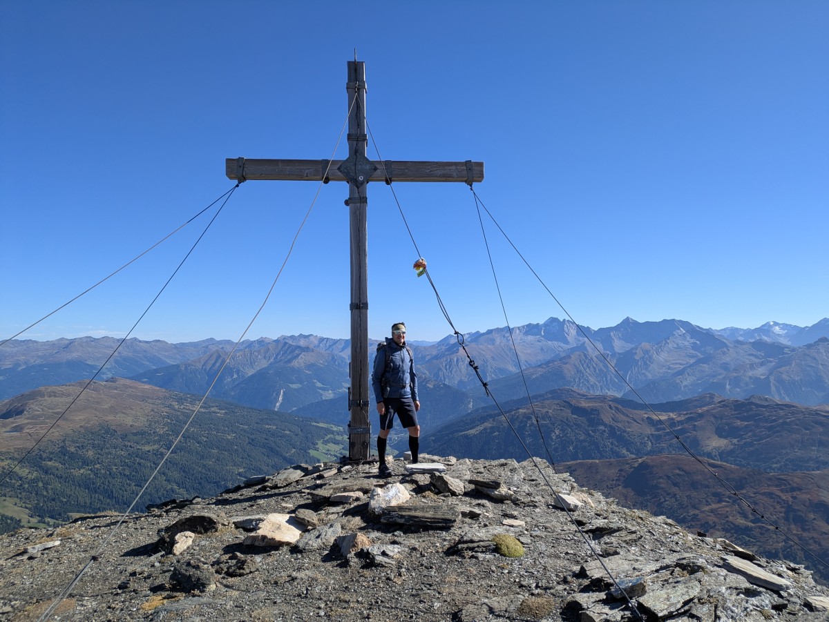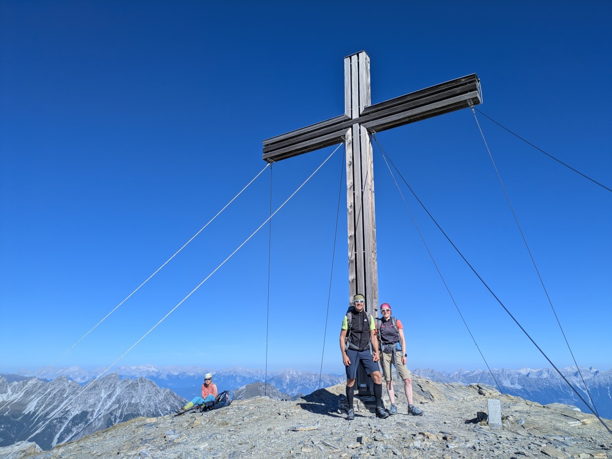 Nur wenig später stehen wir am ersten echten Gipfel des Tages. Am Horizont im Osten bauen sich Olperer und Fußstein auf. Waren wir