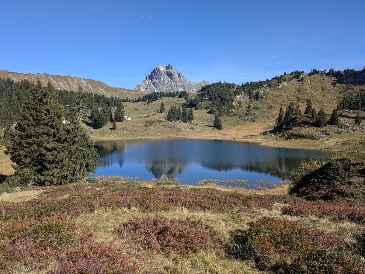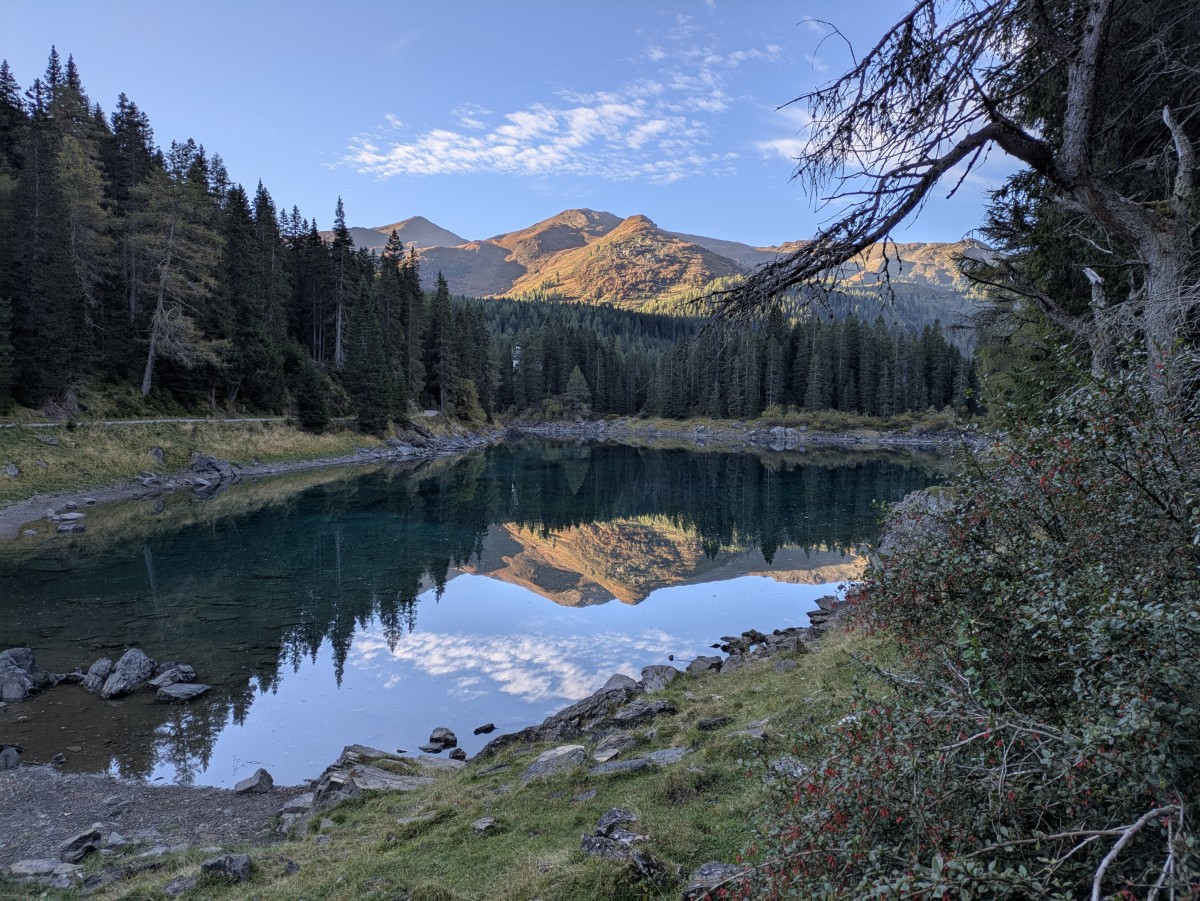 Wir laufen über die Salober-Variante weiter zum Körbersee und genießen auch dort den wolkenlosen Tag. Über dem See erhebt sich der