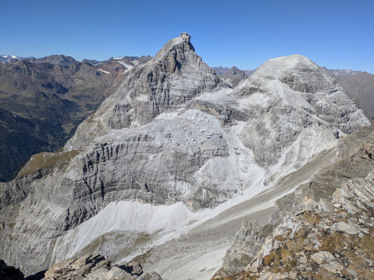 Westlich von mir liegt die gestrige Tour komplett einsichtig vor mir. Zwar wirkt der Obernberger Tribulaun auf dem Bild wie der