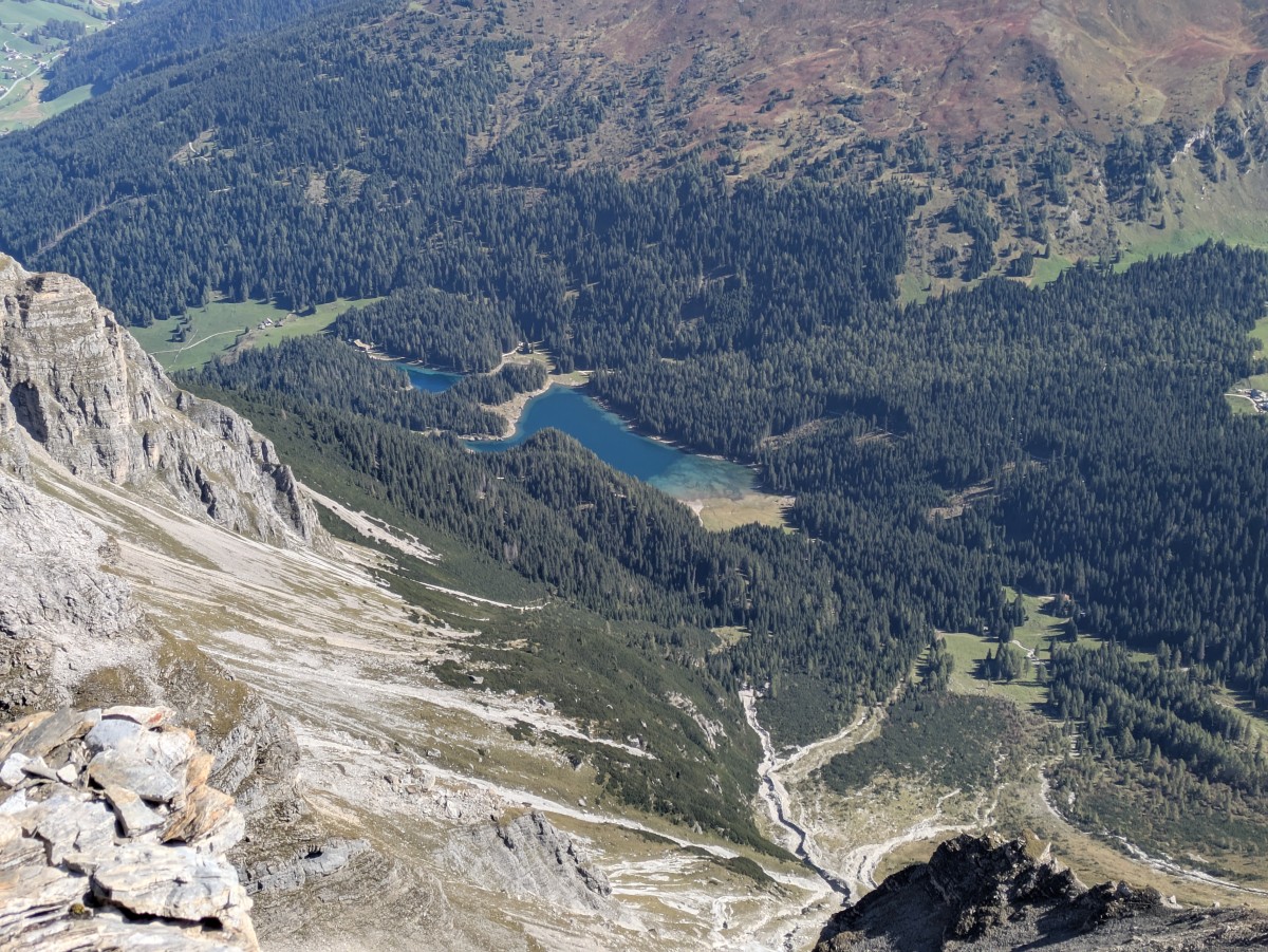 Unter uns leuchtet der Obernberger See tiefblau. Es wird allerdings noch anderthalb Stunden dauern, ehe wir wieder an seinem Ufer stehen.