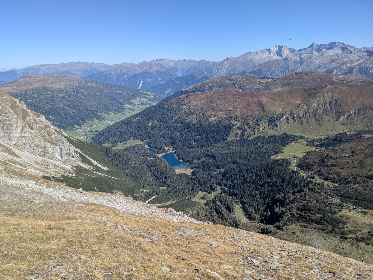 Kurz über dem Portjoch erneut der Blick über den See. Im Tal die Häuser von Obernberg, und rechts am Horizont noch einmal Olperer,
