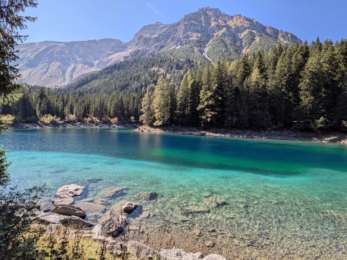 Endlich sind wir wieder am See angelangt. Teile der heutigen weitläufigen Runde können wir über dem karibisch-türkisen Gewässer