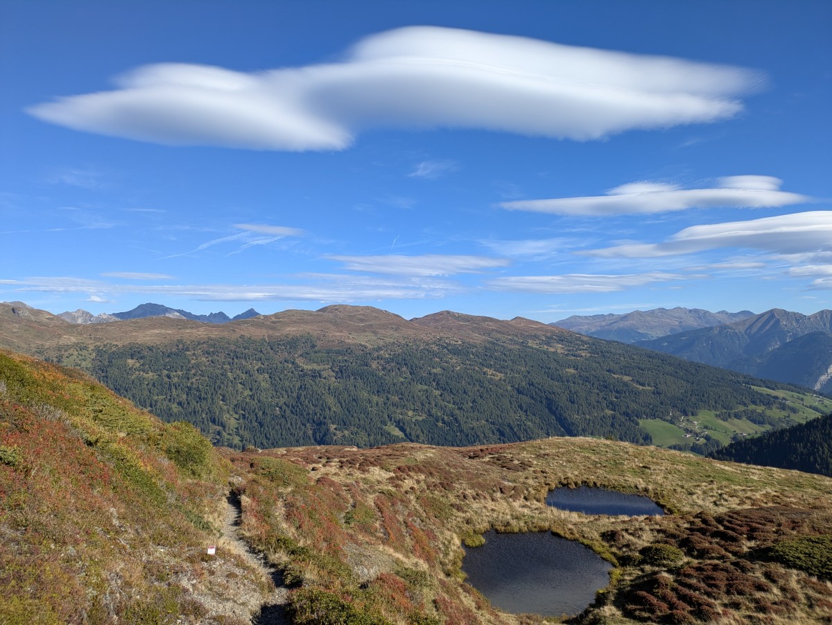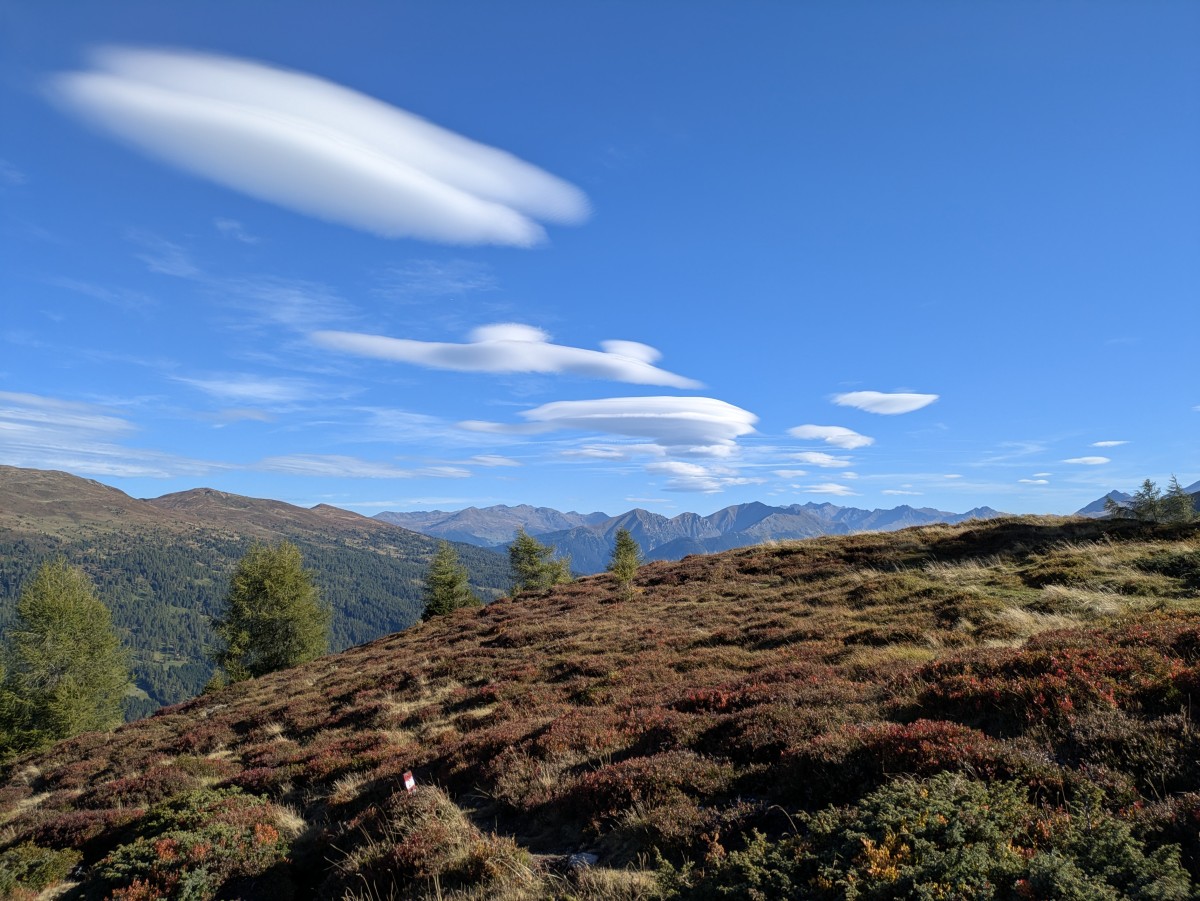 laufe ich zur Allerleigrube hinauf. Über mir zeigen sich einige linsenförmige Fönwolken wie eine Flotte von Raumschiffen.