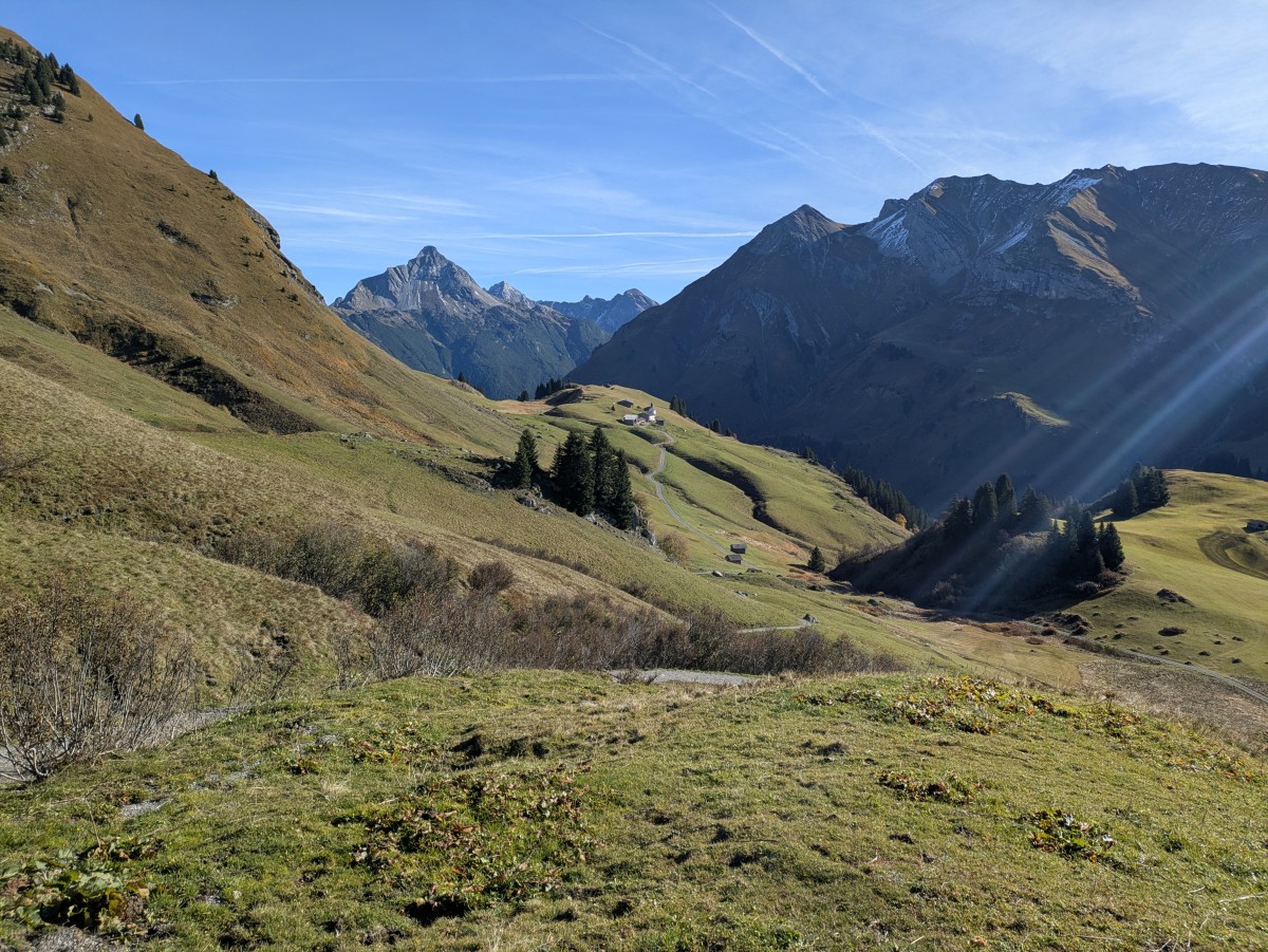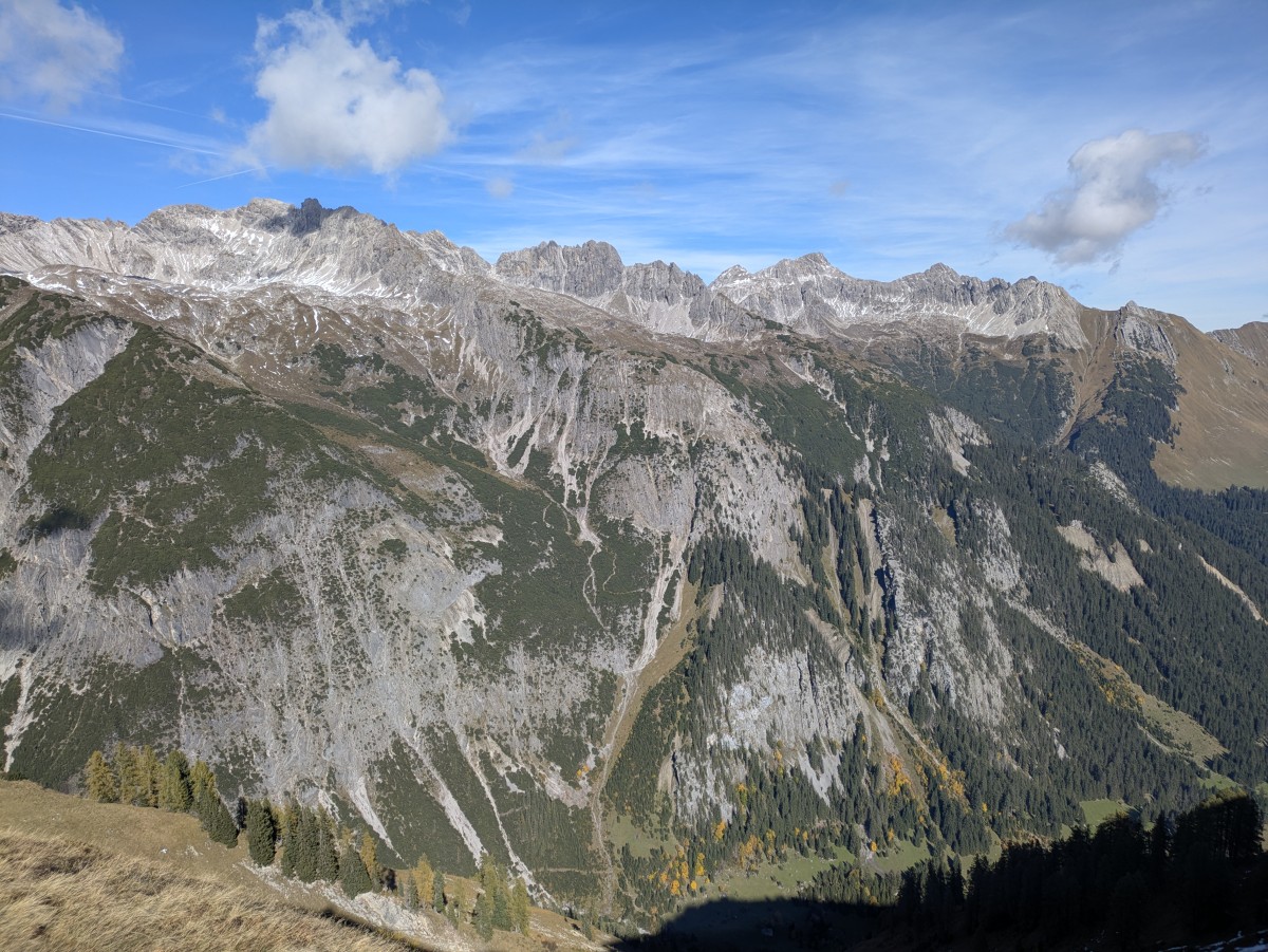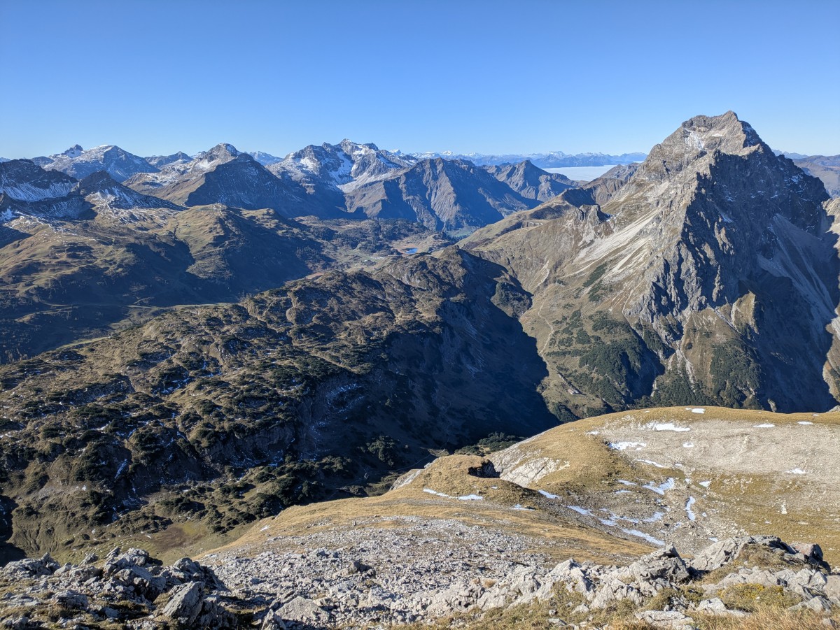 Nach Südwesten erhebt sich der Widderstein, und dahinter das Lechquellengebirge.