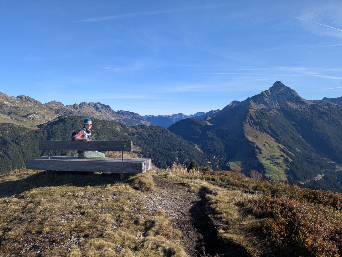 Den beginnen wir mit einer flotten Wanderung hinauf zum Wannenkopf. An der Holzbank rasten wir und lassen die Blicke zum Biberkopf und weiter zur Höfats streifen.
