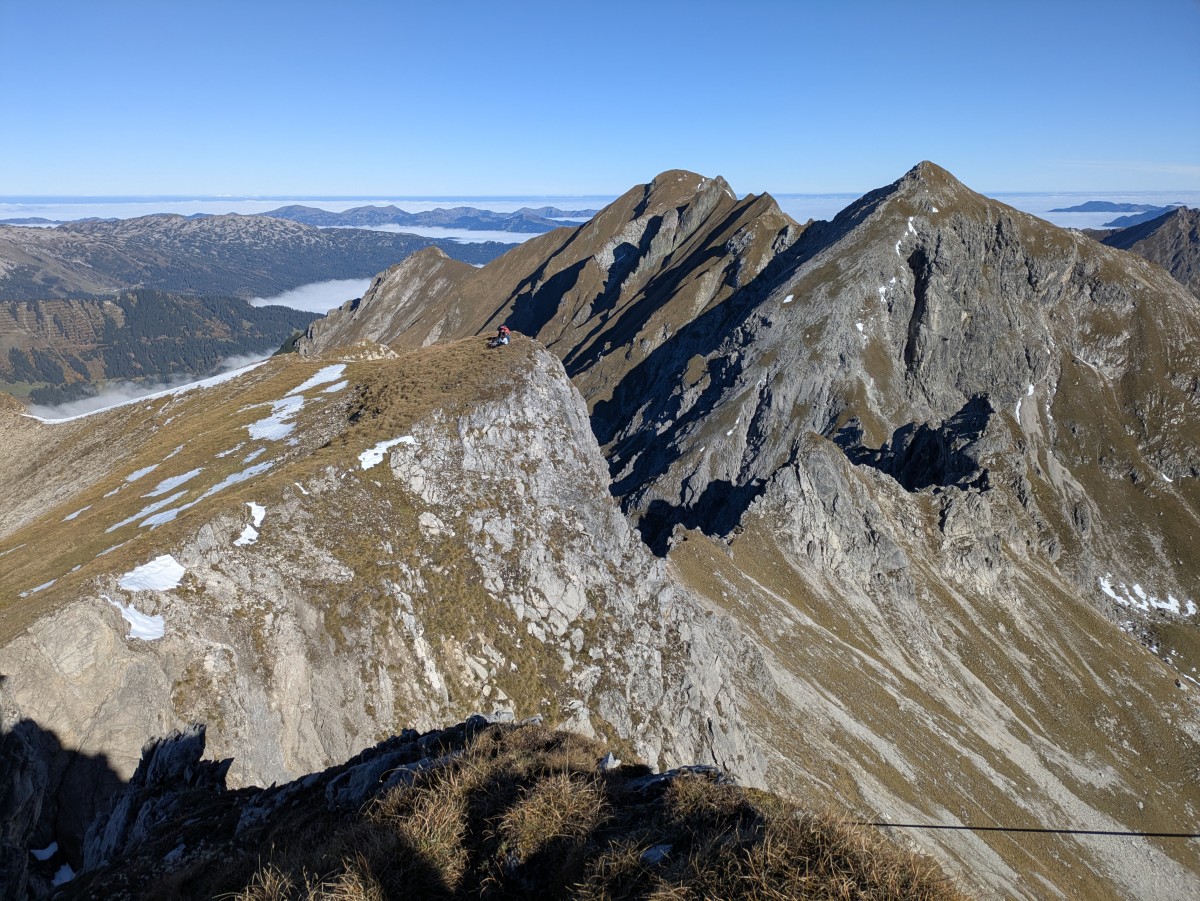 Nach ausgiebiger Gipfelpause am Roßlauf (bei nur wenig Wind, wer hätte das für möglich gehalten!) halten wir uns über den Südgrat