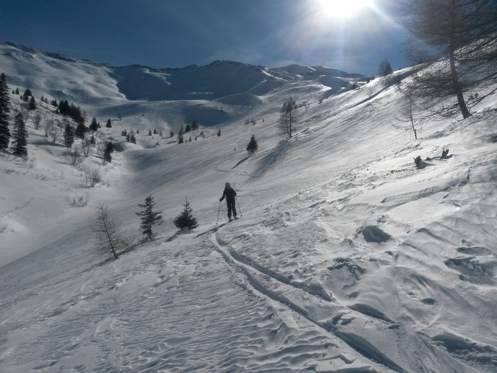 im Talgrund finden wir noch kleine Reste von weichem Pulver. Immerhin ist das Wetter immer noch ausgezeichnet.