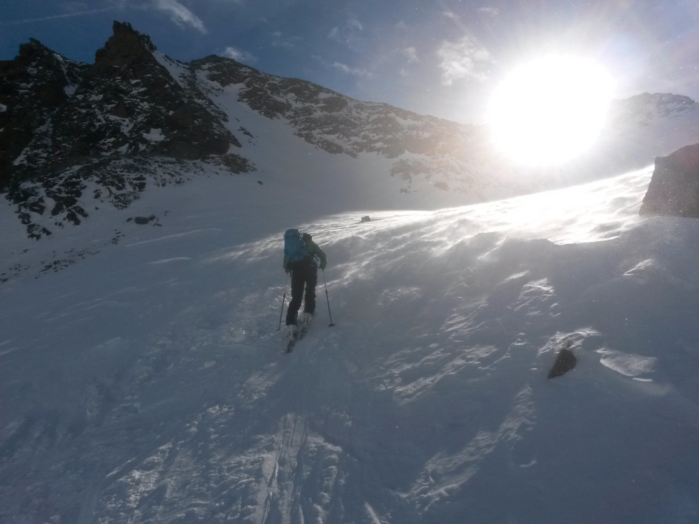 Etwa fünfzig Höhenmeter sind aber dann selbst mit den Harscheisen nicht mehr sinnvoll auf den Skiern zurückzulegen -