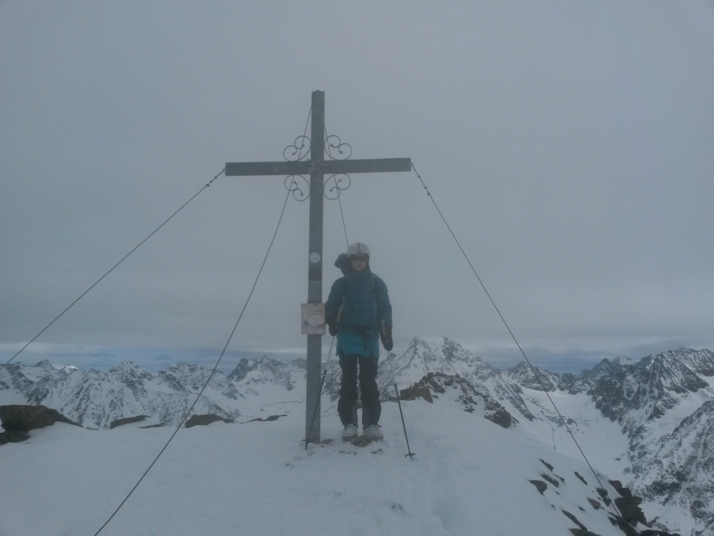 in einem ordentlich stürmischen Westwind. Die letzten Meter zum Gipfel legen wir mit tief ins Gesicht