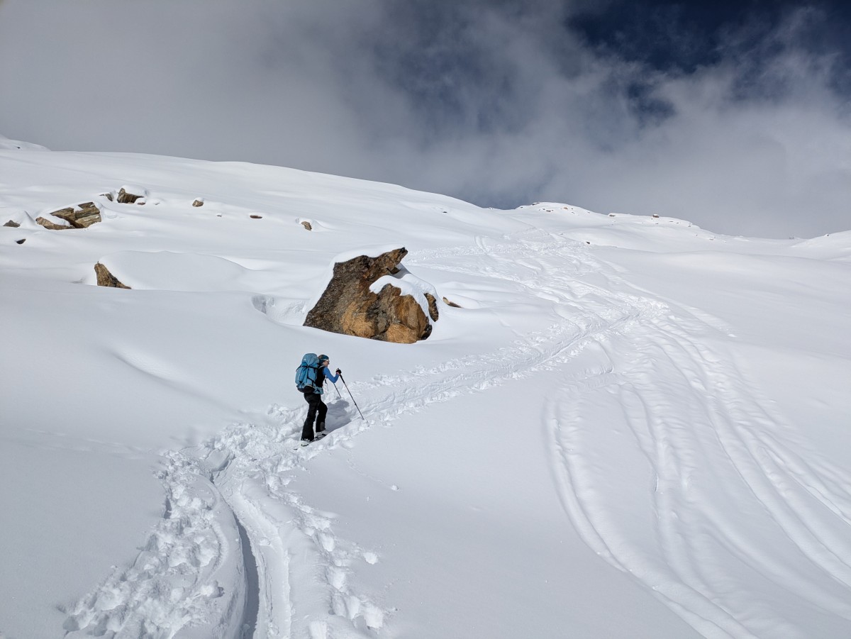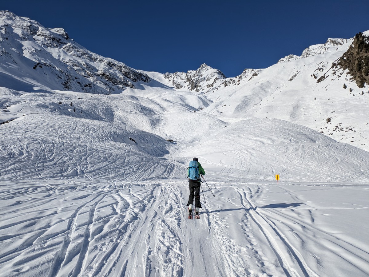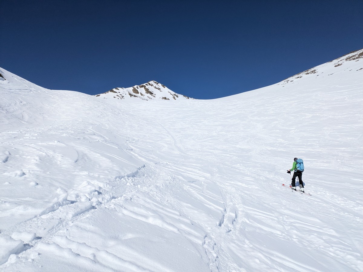 drehen wir um, um eine andere, nicht ganz so glatte Aufstiegsvariante zu wählen. Bei dem kurzen Zurückrutschen mit Fellen zum
