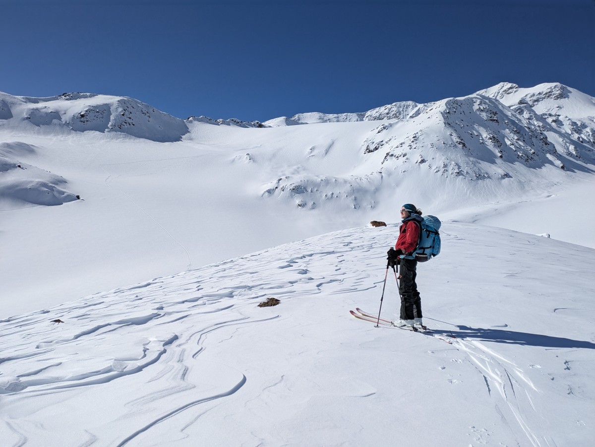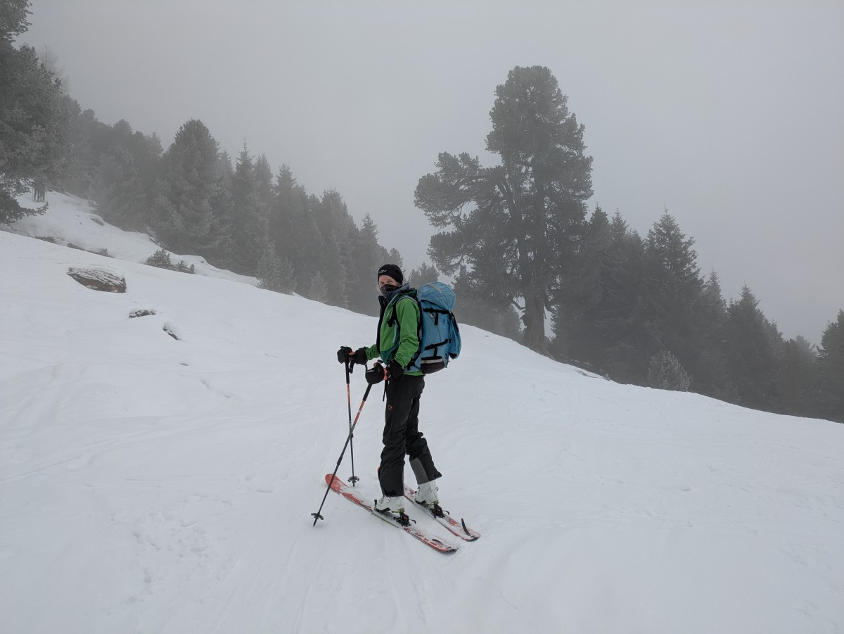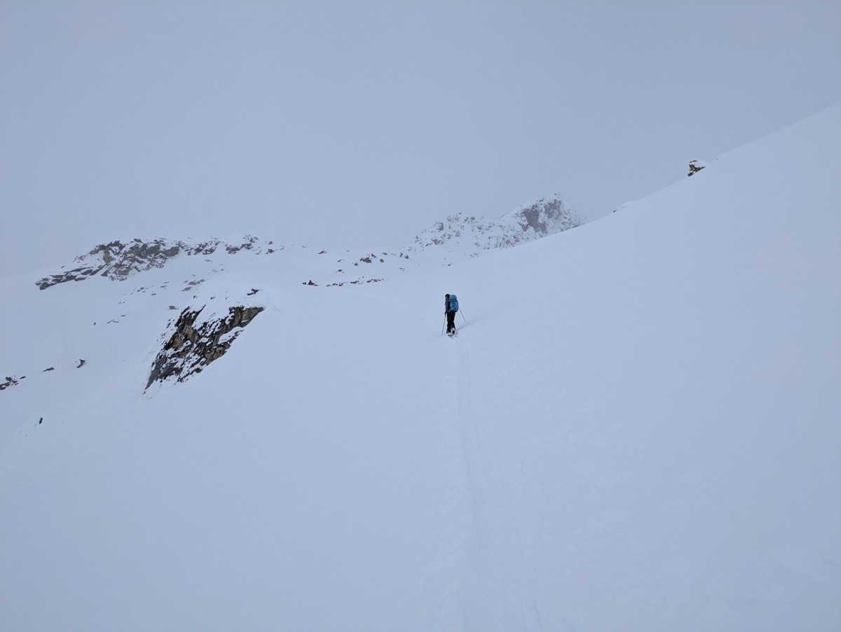 drehen wir um, um eine andere, nicht ganz so glatte Aufstiegsvariante zu wählen. Bei dem kurzen Zurückrutschen mit Fellen zum
