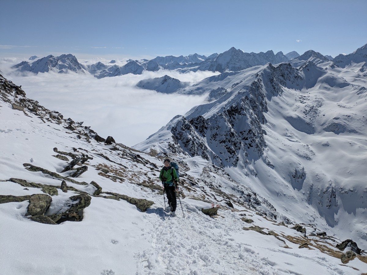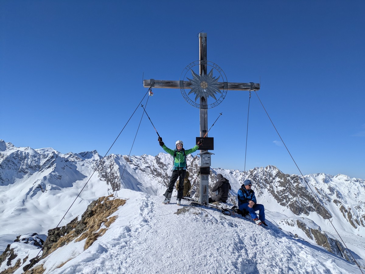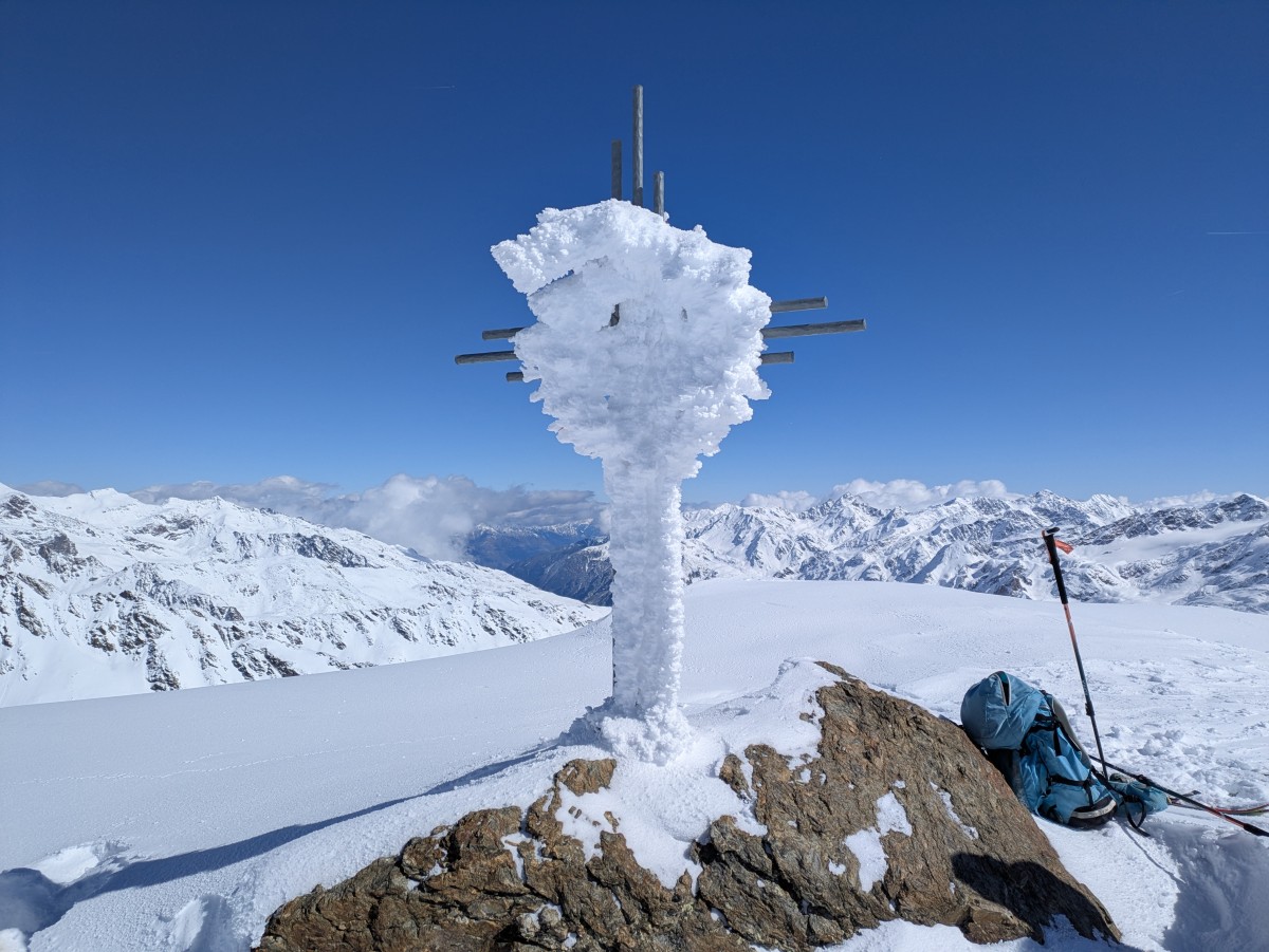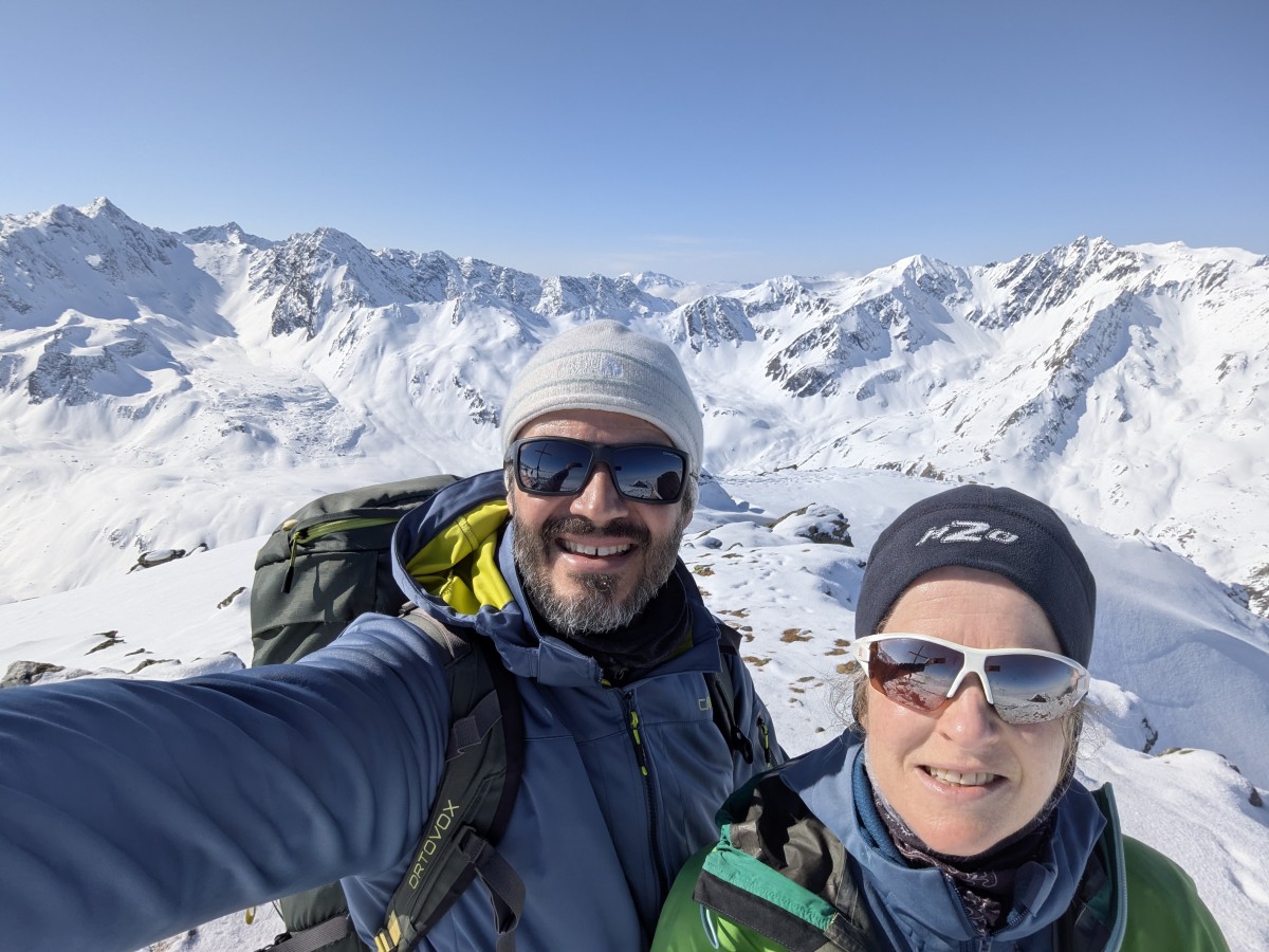 weitergehen. Auch hier haben wir das Glück, eine frische Spur vorzufinden. Am Gipfel werden wir uns bei dem Südtiroler Bergführer