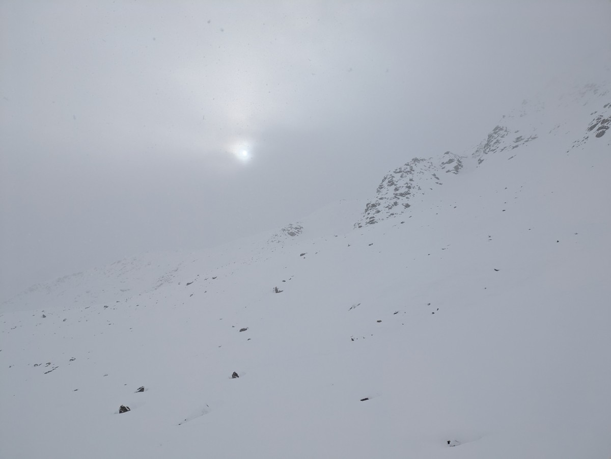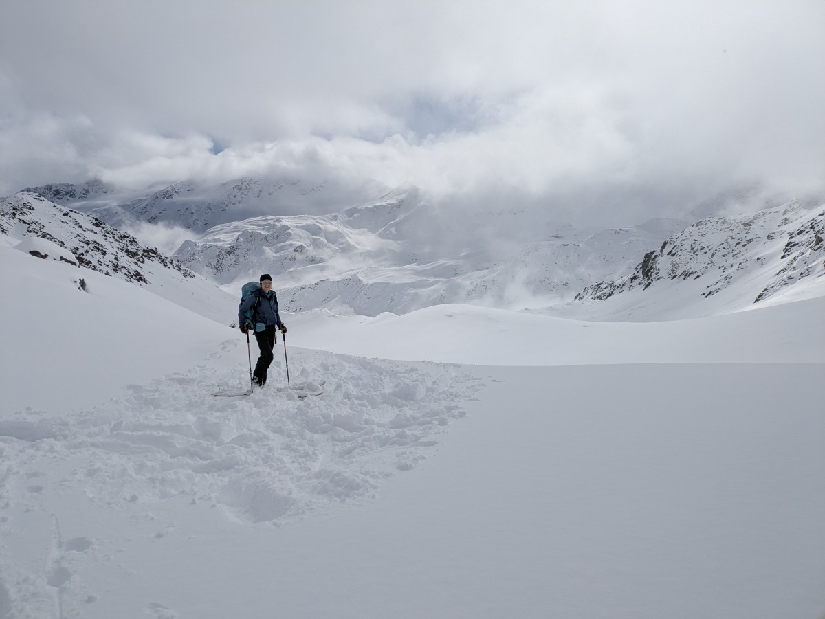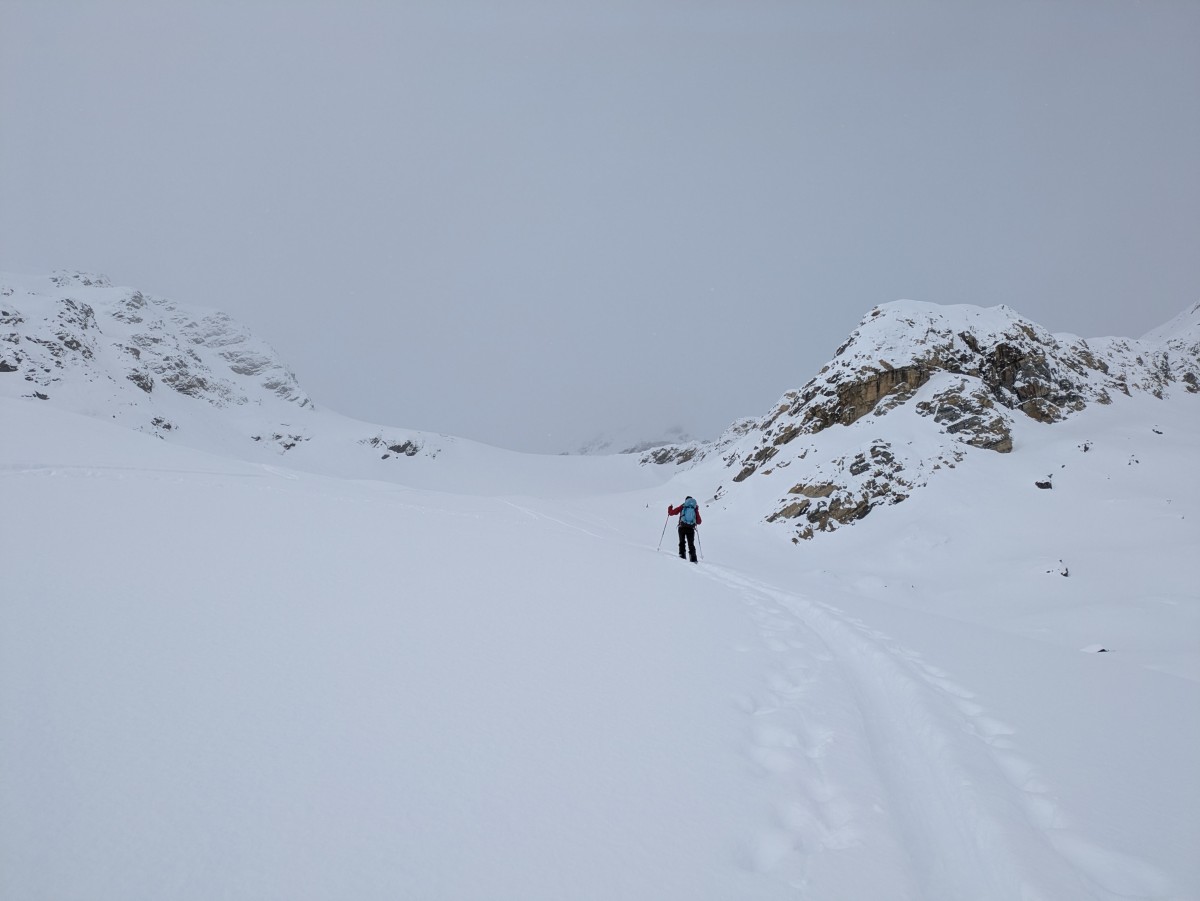 Am nächsten Tag laufen wir das lange Tal zur Eisseespitze hinein. Der Schneefall und die Wolken erlauben nur selten eine gute Sicht
