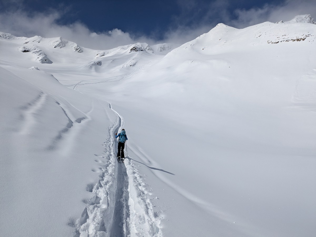 Wir haben das Glück, den über Nacht komplett neu eingeschneiten Anstieg nicht selbst spuren zu müssen. Eine starke Vierergruppe