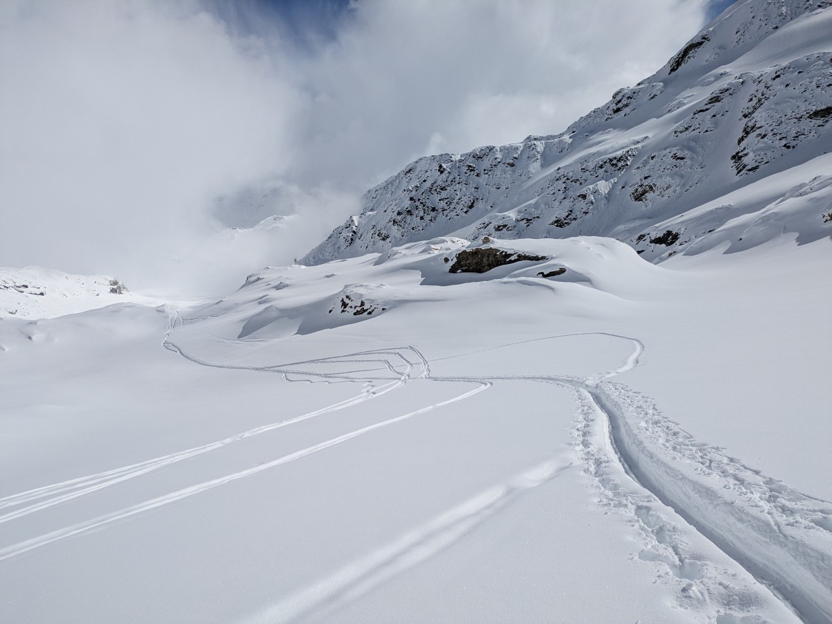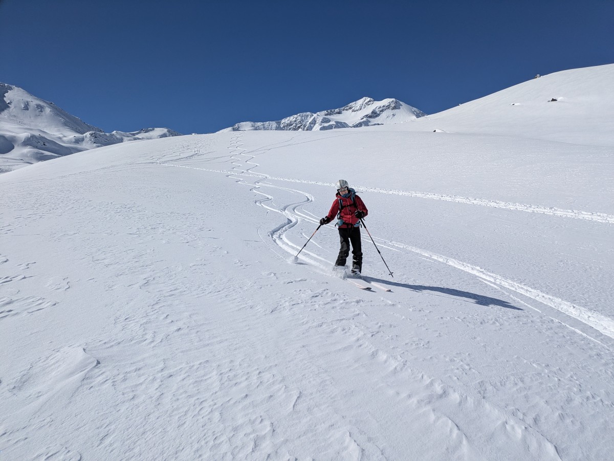 Wir genießen die schöne Pulverabfahrt selbstredend genauso wie am Tag zuvor, wenn auch in einer leicht anderen Variante. Schön, in