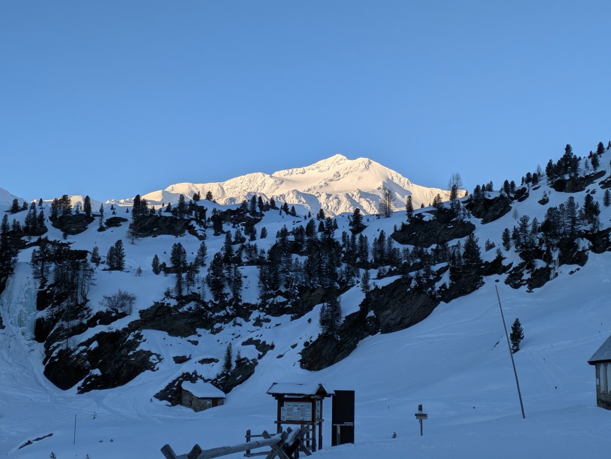 Am nächsten Morgen gleißt die Zufallspitze in der frühen Sonne. Wir starten bei den tollen Bedingungen zu den Tre Canoni.